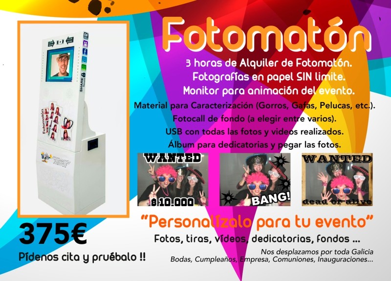 Alquiler de Fotomatón para todo tipo de Eventos.... Bodas, Comuniones, eventos de empresa, cumpleaños,... Nos desplazamos por toda Galicia Alquiler de máquina fotomatón sin límite de fotos.... 5x15 o 10x15, personalizables con vuestros nombres o con la imagen que querais. Atrezzo para disfrazarse, fondos divertidos a elegir. Entrega de USB con copia de todas las fotos, tiras de fotos y vídeos realizados.