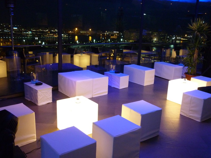 Tenemos mucho material propio ( Escenarios, gradas, con asiento y sin asientos, vallas, catenarias (separadores) pista de baile, suelos entarimados, photocall, carpas, sonido, iluminacion y todo lo que se puede necesitar en una celebración o evento de empresa.
