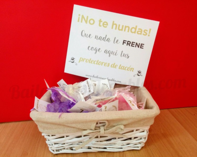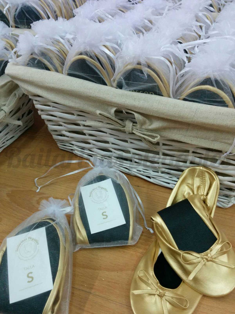 Como bien indica nuestro nombre, vendemos bailarinas plegables, calzado de emergencia para las invitadas de bodas, fiestas y eventos. Un detalle original y muy útil que cada vez más parejas deciden incluir en sus bodas, así no hay que sufrir por los taconazos en el momento del baile y se aguanta hasta que el cuerpo diga basta! Además las invitadas se las llevan como obsequio y son reutilizables para todas las fiestas que vengan. También disponemos de protectores de tacones para que el césped o la gravilla no sean un problema, que los tacones no se hundan ni se ensucien. Montamos bonitos packs que ya lo incluyen todo, las bailarinas plegadas o los cubretacones en sus bolsitas de organza, con tarjetas que indican la talla y todo colocado en bonitas cestas de mimbre y con un cartel de reclamo. Listo para ponerlo el gran día.