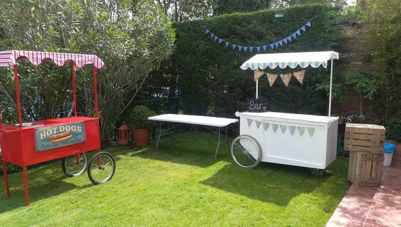 Alquiler de carritos de comida para eventos. Disponemos de Carritos de Perritos Calientes, Hamburguesas, Palomitas, Algodón de Azúcar, Crepes, Gofres, Helados..