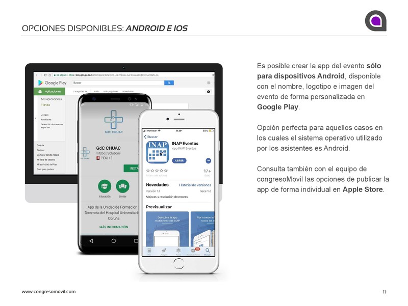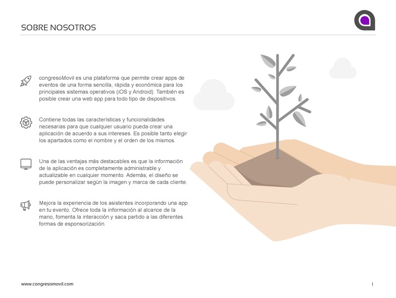 Aplicaciones para eventos, congresos y convenciones. Versiones nativas para Google Play y Apple Store (iOS, Android). Versión webapp también disponible. El mejor precio del mercado con todas las funcionalidades que los organizadores necesitan. Incluye la info general: agenda, ponentes, documentos, comunicaciones, áreas... Descubre las opciones interactivas: registro de asistentes, área privada, networking, chat, muros, votaciones, encuestas, fotogalería, avisos y tecnología beacon. Utiliza las funcionalidades de esponsorización. Listado de empresas expositoras, sponsors, slider de logotipos, anuncios y mucho más. Crea un diseño 100% personalizado según la imagen del evento. Toda la configuración y contenido disponible desde el panel de administración. Con todas las estadísticas e instalaciones en tiempo real.