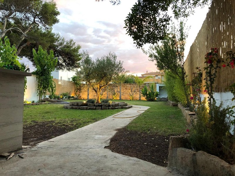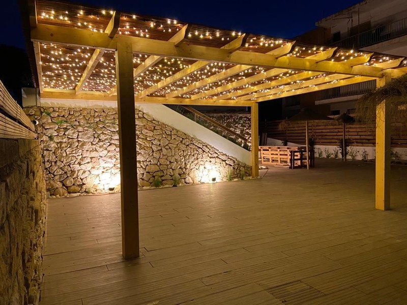 Donde se accede desde la calle y es un espacio abierto con barra fija y palapas. Pasillo al exterior que conduce a la parte trasera donde se vislumbra nuestro romantico jardin, centrado por un olivo, parras y barraja fija.