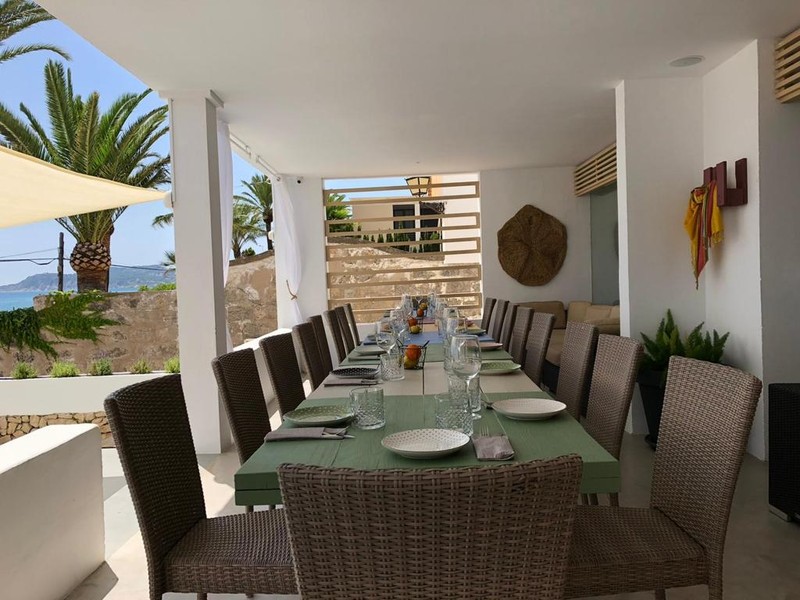 La zona de planta alta, que se accede desde la parte exterior baja por escaleras al aire libre y vestidas con jardineras de Lavanda. La parte alta se puede mezlar un pequeño espacio al aire libre, cubierto por una gran vela que permite dar sombra en horas de sol y ademas una zona cubierta y acristalada donde se ve el mar direcamente.