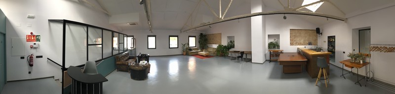 220 metros cuadrados dividido en 2 espacios. Uno diáfano de 130 metros con wifi (fibra), proyector, altavoces, micrófonos, mesa de mezclas, aire acondicionado, sillas y mesas, barra con cámaras y cafetera, mesa de billar, sofás…