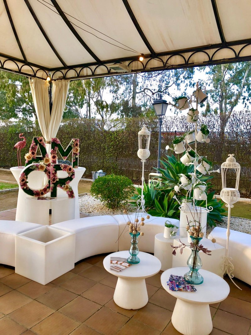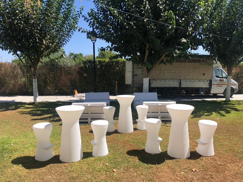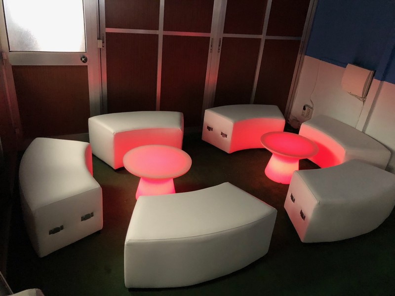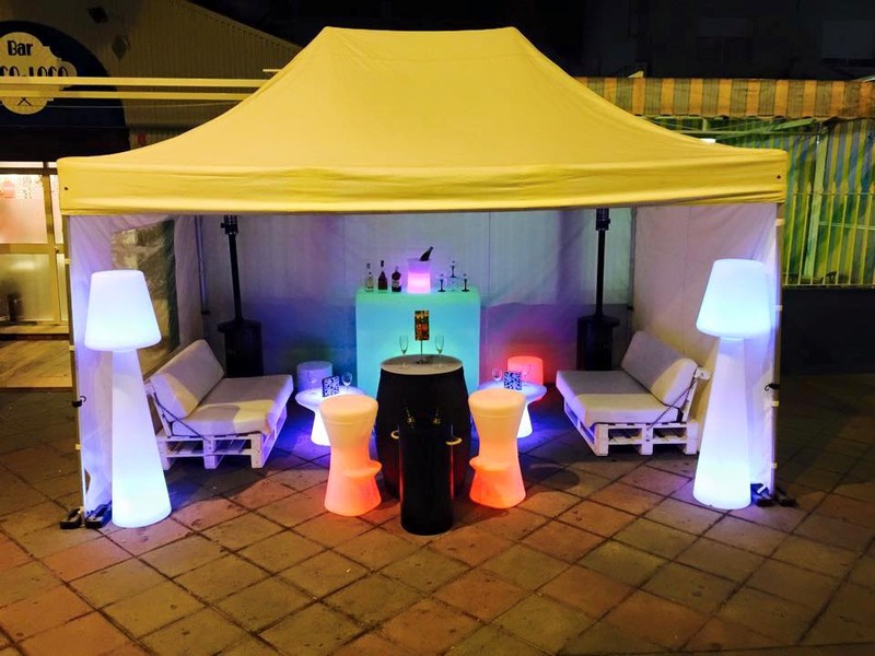 Acondicionamiento de espacios para eventos y celebraciones con mobiliario iluminado y temática chillout.