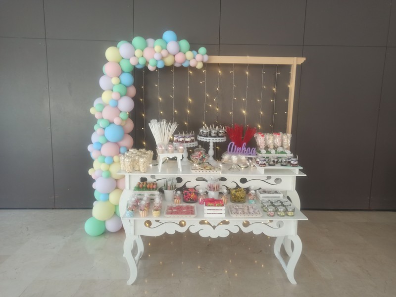 Además completamos nuestros servicios decorando con globos, carrito de candy bar y otros muebles para el montaje de las mesas dulces o canyd bar, gran variedad de golosinas, etc.