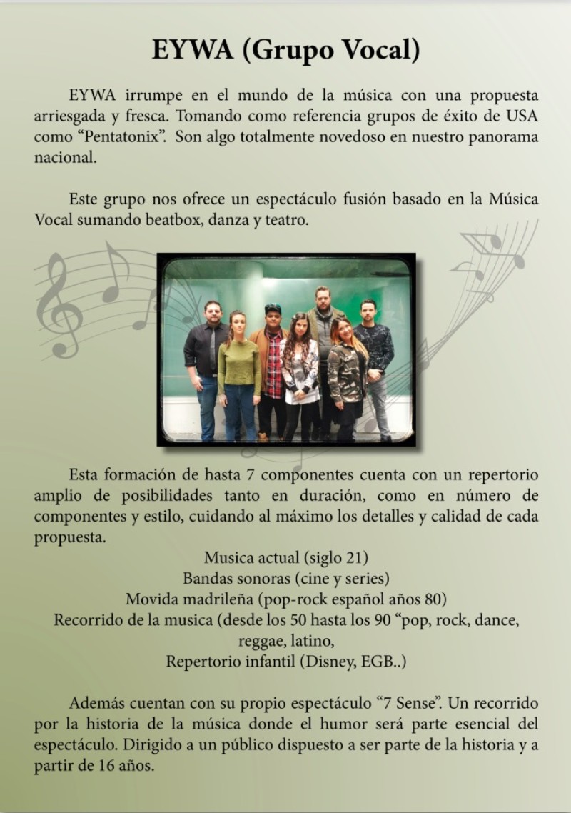 Eywa es un grupo vocal (acapella con Beatbox) que se formó para dar vida a la música. Queríamos aportar algo diferente y original y así sorprender al público.
