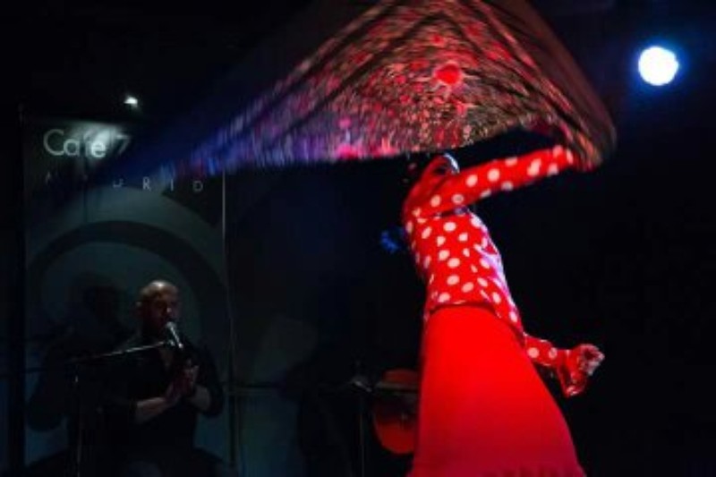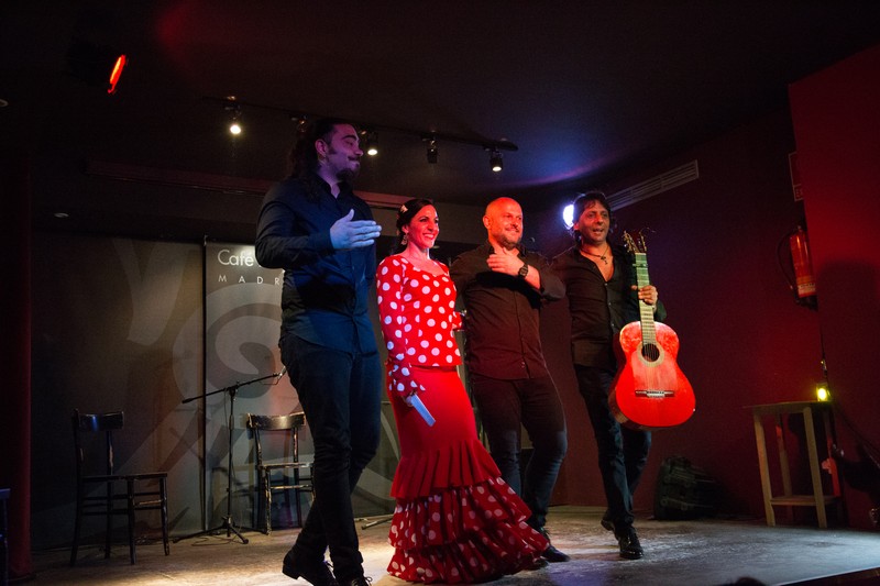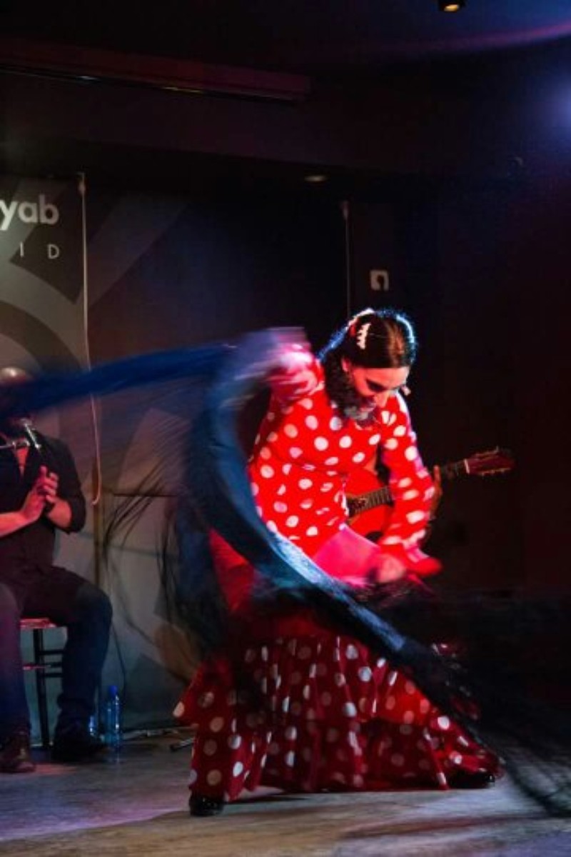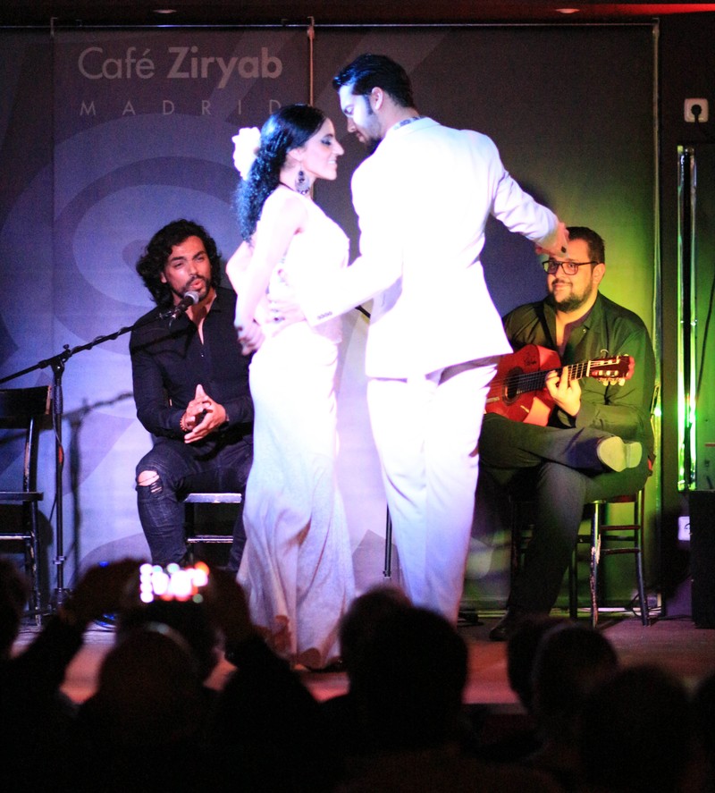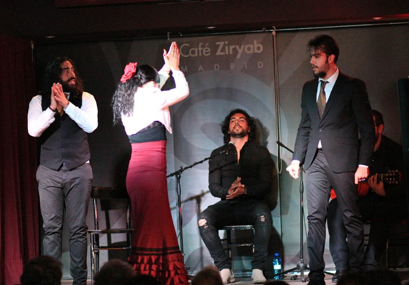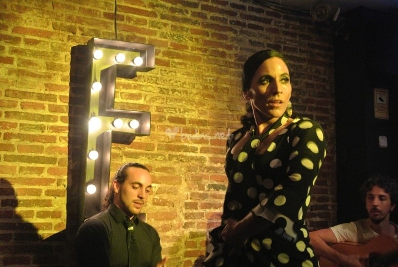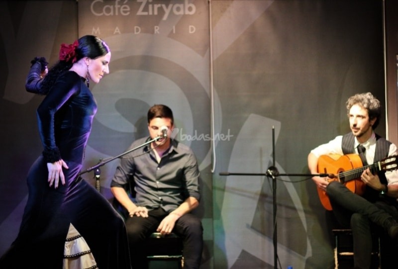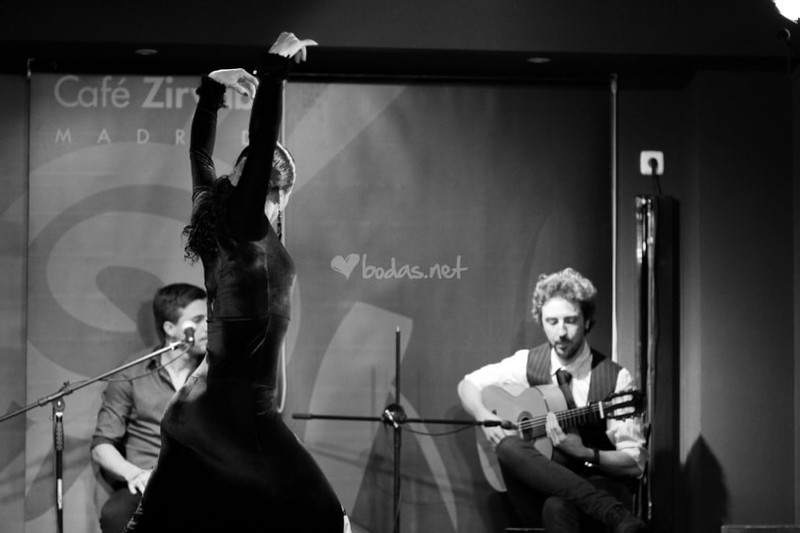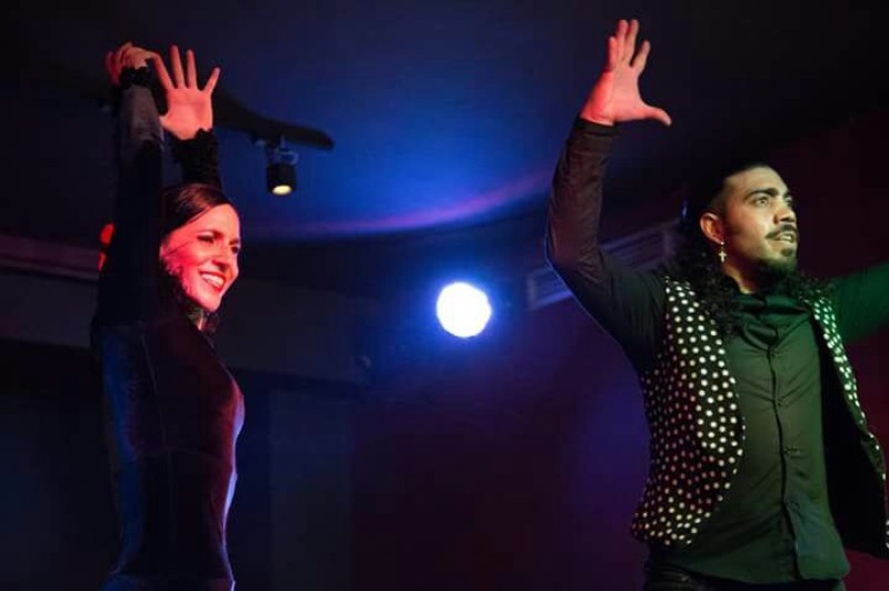 Solemos trabajar con guitarra cante y cajón, a demás los bailaores, que pueden ser dos chicas, me incluyo, o yo sola, o bailaor y bailaora. mis acompañantes suelen ser gitanos, tanto los músicos como los bailaores que me acompañan sobre el escenario.