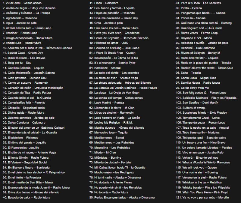 La mayoría son versiones de pop-rock de los 80. (Héroes del silencio, Alaska, Loquillo, Fito y los Fitipaldis, Leiva, Radio Futura, Jarabe de Palo, Creedance, Amaral, etc.) y también canciones propias (Tiempo de gozar, “Al final hi ha llum”, “Soc Feliç sense tú”, “Amainar” y “Raras veces”).