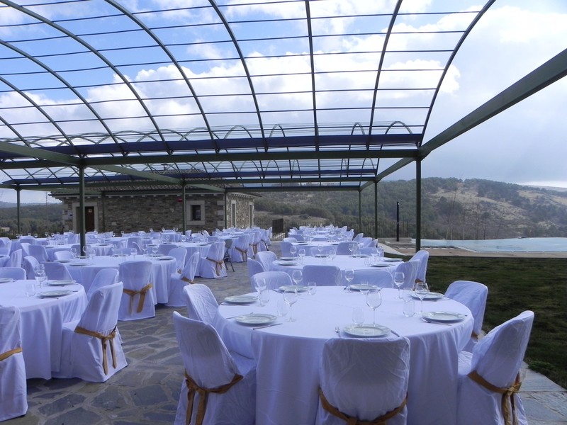 En exteriores contamos con una finca de una hectárea y media, donde tenemos una carpa cubierta de 300 m² y capacidad hasta 300 comensales, una explanada de césped de 1000 m² (con un precioso cenador para celebrar ceremonias), impresionante piscina con cascada desbordante, solárium, balneario y SPA. En la propia finca tenemos aparcamiento hasta 120 coches.