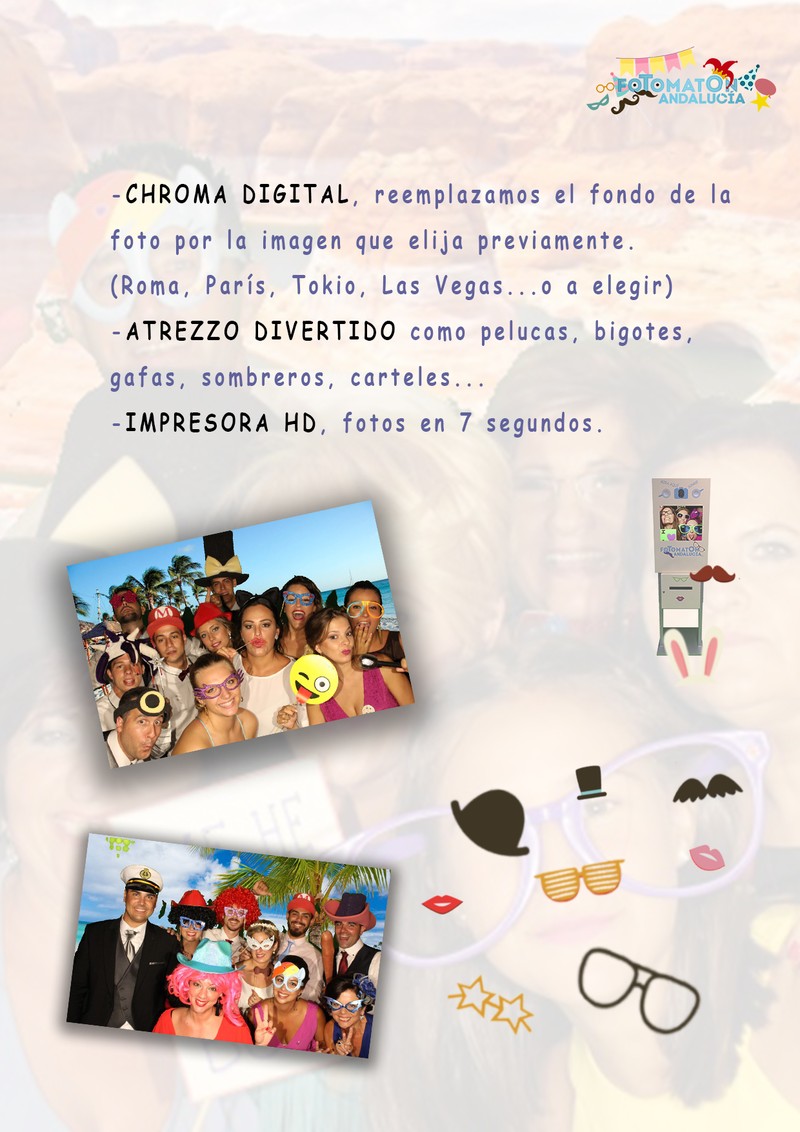 Fotomatón Andalucía es una empresa especializada en la organización y montaje de fotomatones. Animarán vuestro enlace para que sea inolvidable y hacer que todos vuestros invitados disfruten de ese día tan mágico, haciéndose fotos increíbles con la máxima calidad en impresión, que guardarán para siempre como recuerdo. Servicios que ofrece Fotomatón Andalucía quiere hacer de vuestro día algo inolvidable tanto para vosotros como para vuestros invitados, es por eso que pone a vuestra disposición sus servicios de fotomatón para que podáis pasar un rato de lo más entretenido haciéndoos fotografías sin límite, dándoles un toque divertido gracias a su variado atrezzo. El servicio cuenta con: Montaje del fotomatón Photocall 2,50x3 Chroma digital personalizado,para que todos tus fotos sean diferentes Cámara Réflex 18 megapíxeles Pantalla táctil para elegir el fondo de la foto Iluminación led Personal: dos operarios que se encargan de todo Todo tipo de atrezzo,