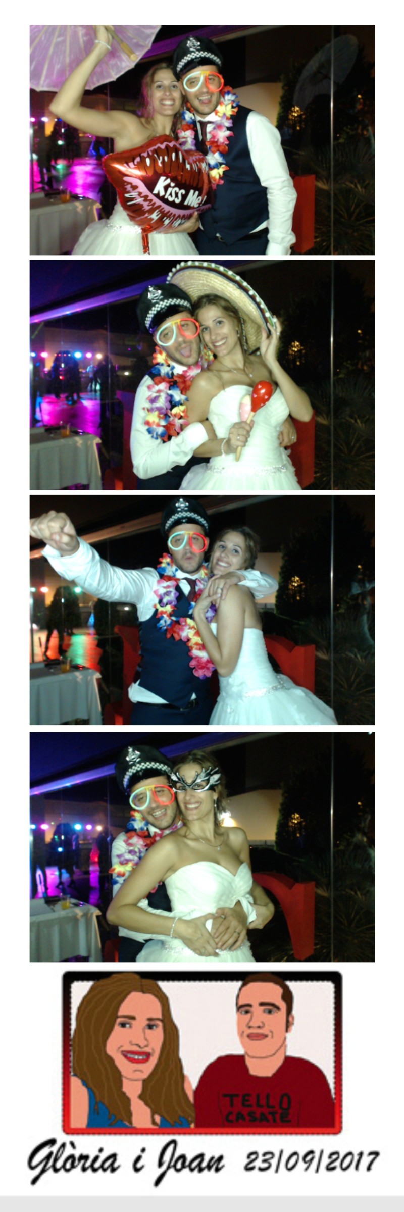 Oferim un servei excepcional a uns preus molt competitius. Disposem d'un atrezzo molt variat per fer les fotos més divertides i també disposem de dos formats diferents de tires fotogràfiques que s'imprimeixen al moment. El format 10x15 amb 1 sola fotografia i el format 5x15 amb dues fotografies idèntiques.