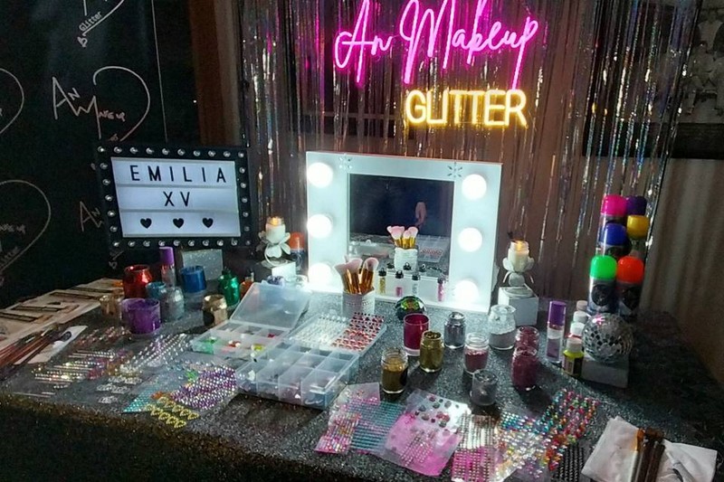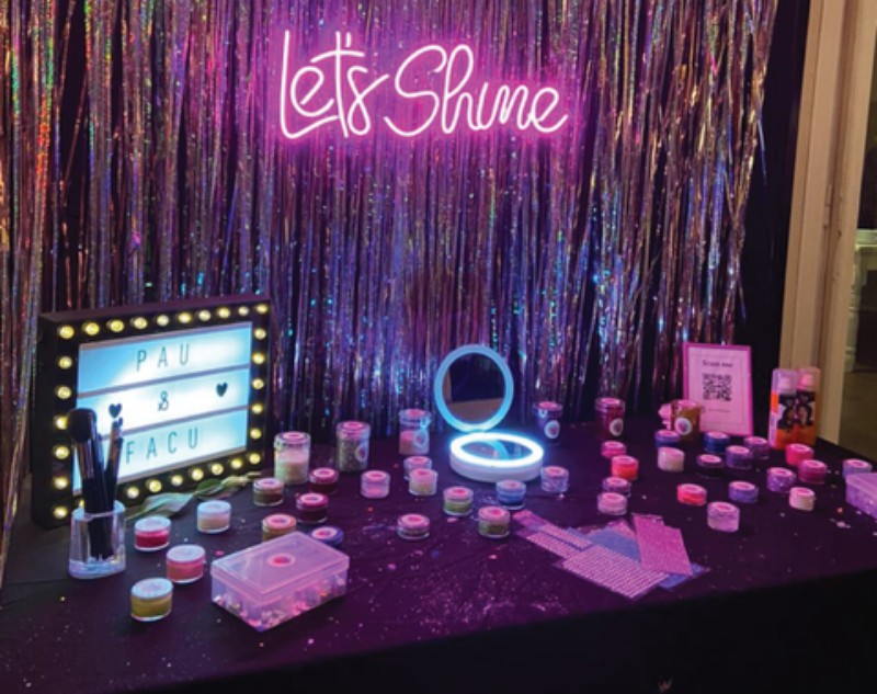 Versatilidad: Un Glitter Bar puede adaptarse a diferentes tipos de eventos, ya sean formales o informales. Puede ser una adición divertida a una fiesta de cumpleaños, una boda, una despedida de soltero/a, un festival de música, un evento corporativo o cualquier ocasión en la que desees agregar un poco de brillo y glamour.