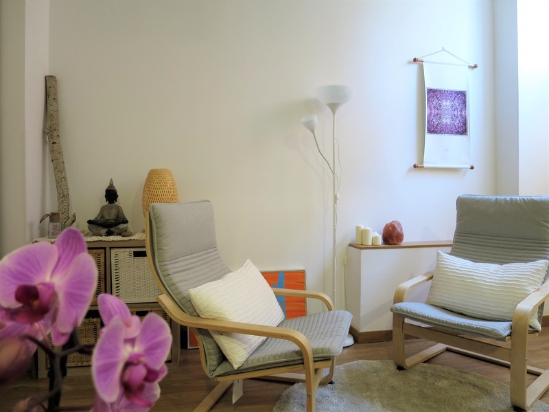 Sala Zen: 10 m2 con butacas y camilla de masaje.