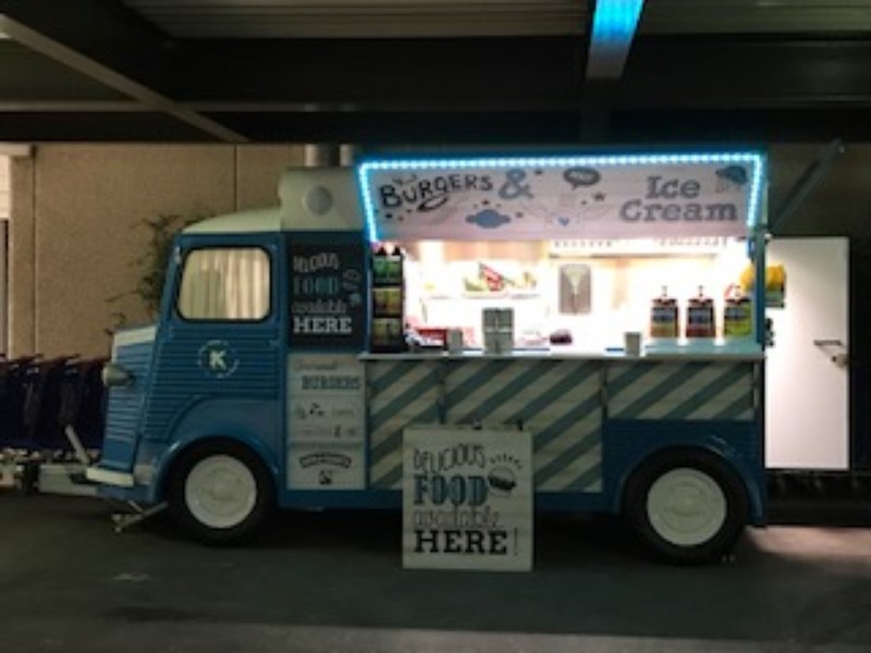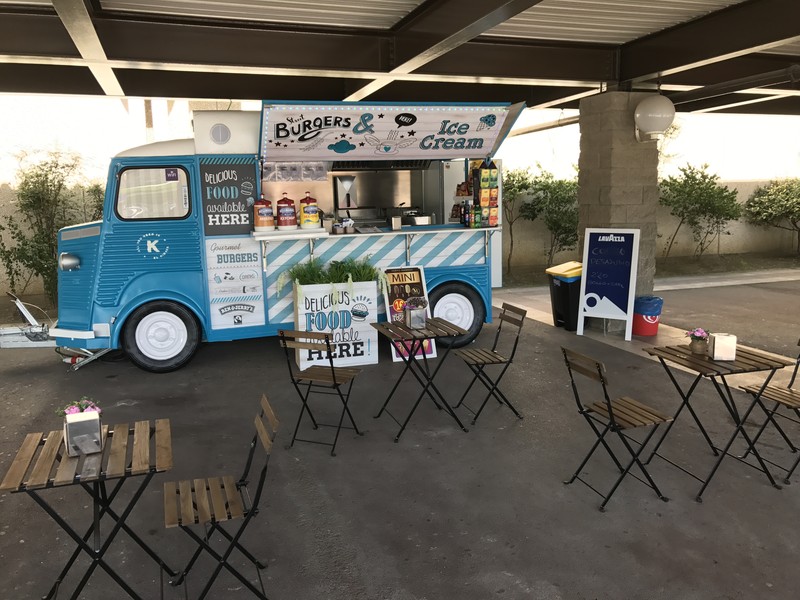 Food truck vintage de hamburguesas gourmet. Equipado con wifi, pago con tarjeta, sistema de audio y cafetera.